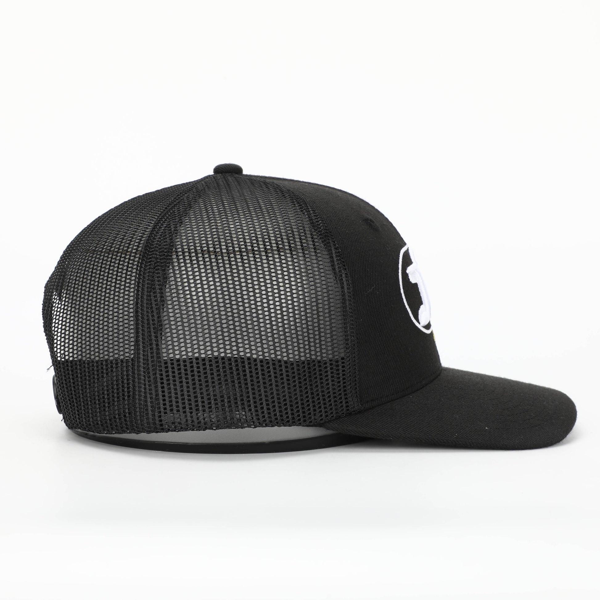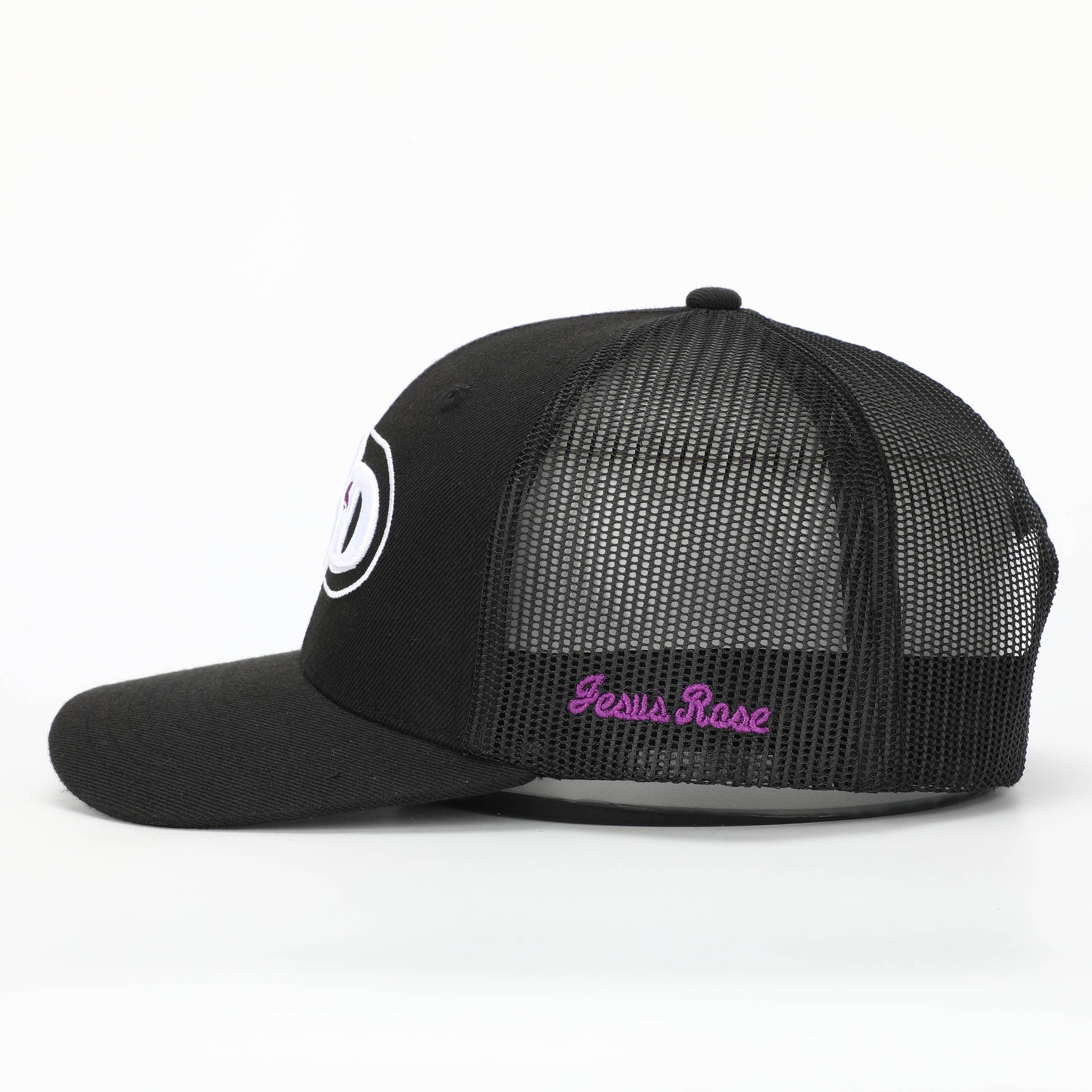 One size fit all, all black trucker Trucker snap back hat. Front logo is white, purple, and gold with raised embroidery. Side logo, purple with flat embroidery.